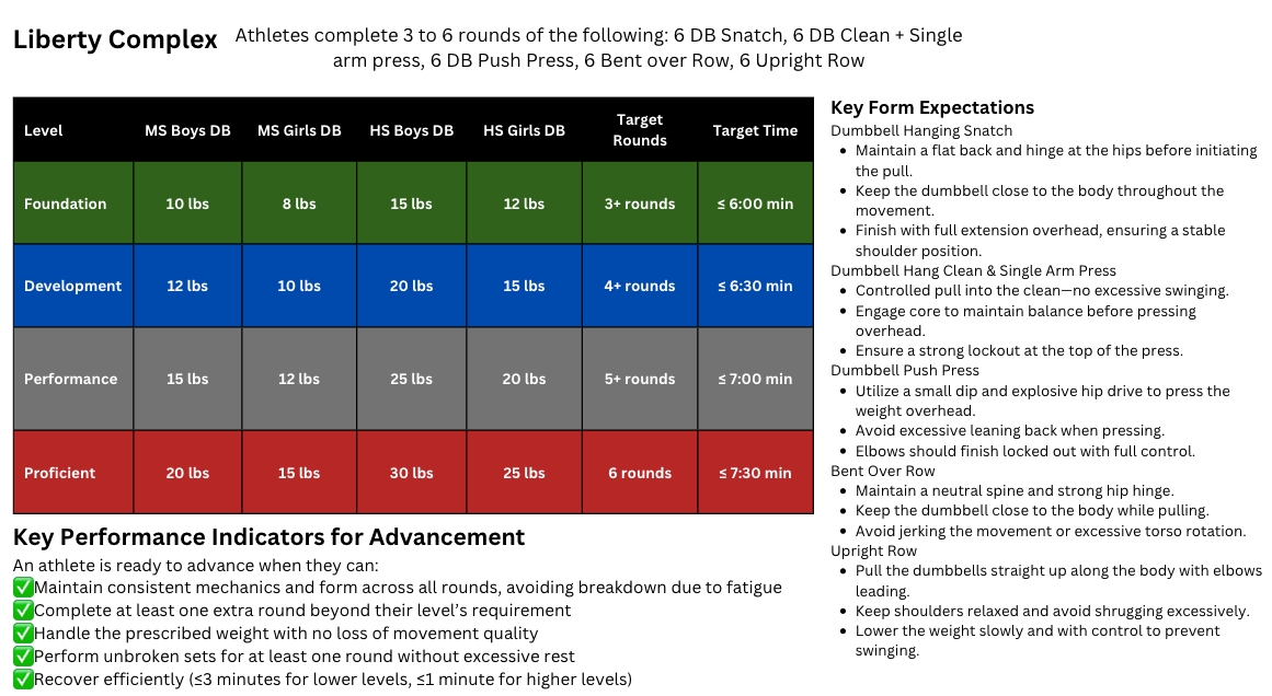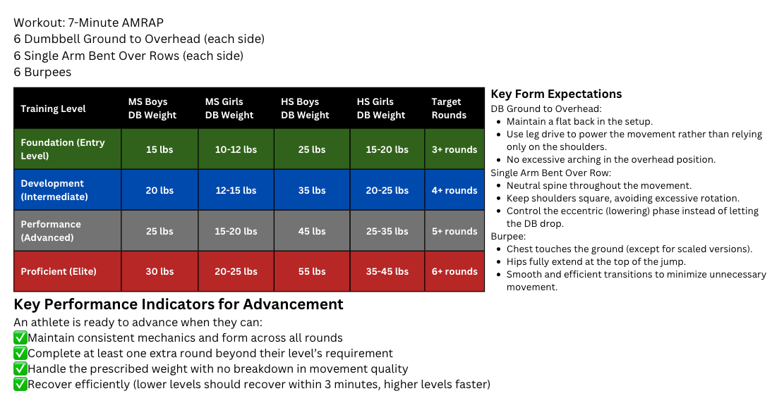 6 DB Snatch, 6 Clean+single arm press, 6 Push Press, 6 Bent over row, 6 Upright row